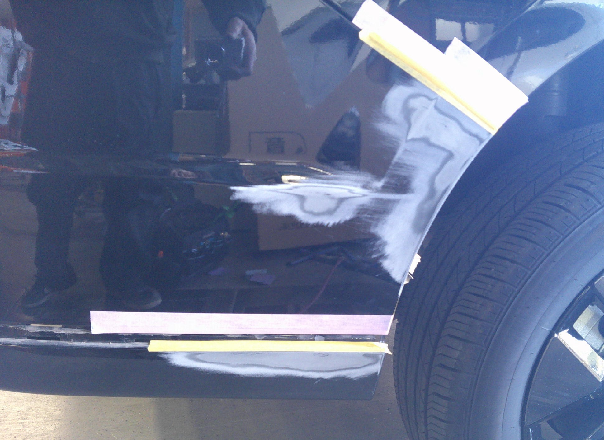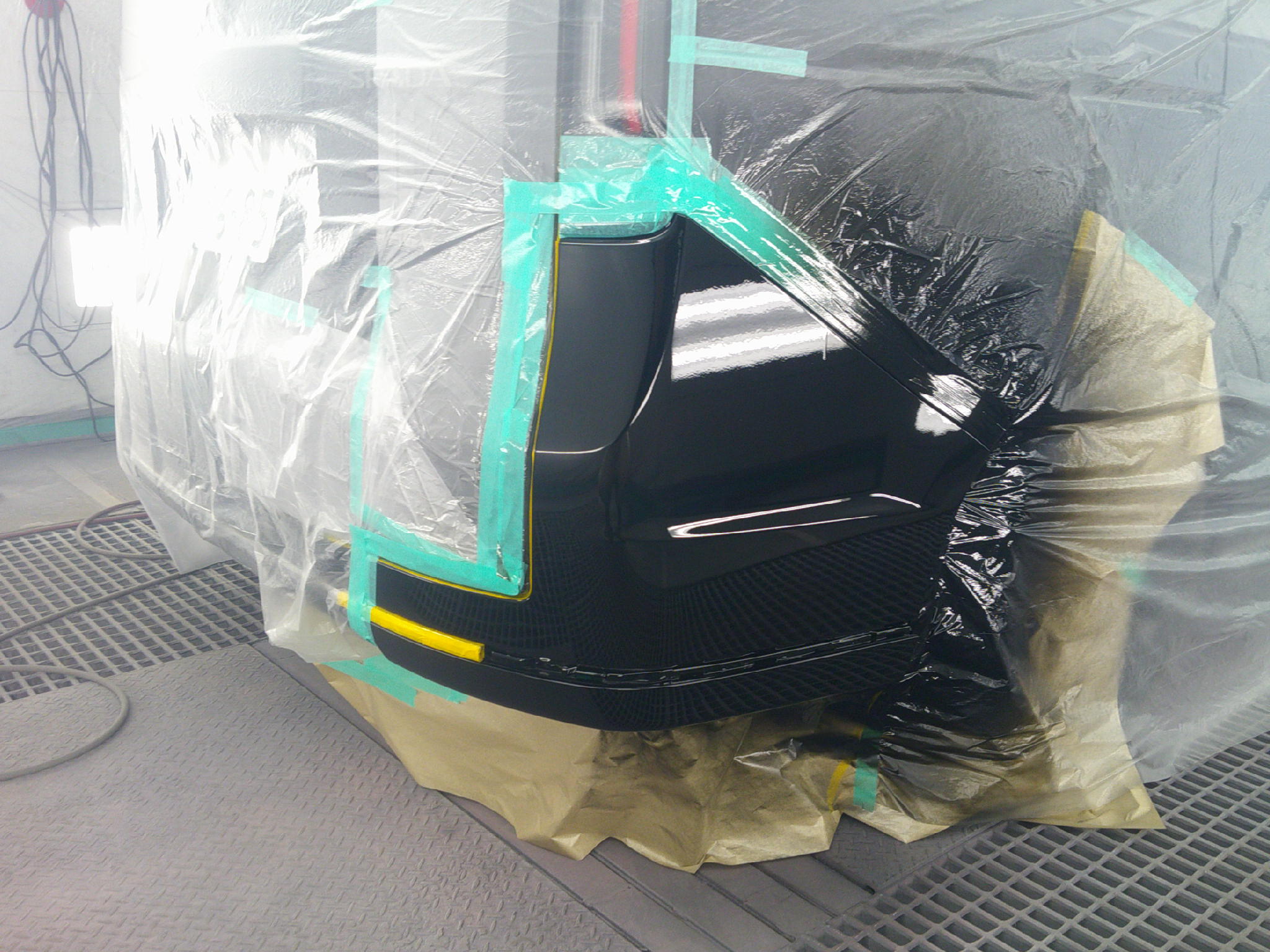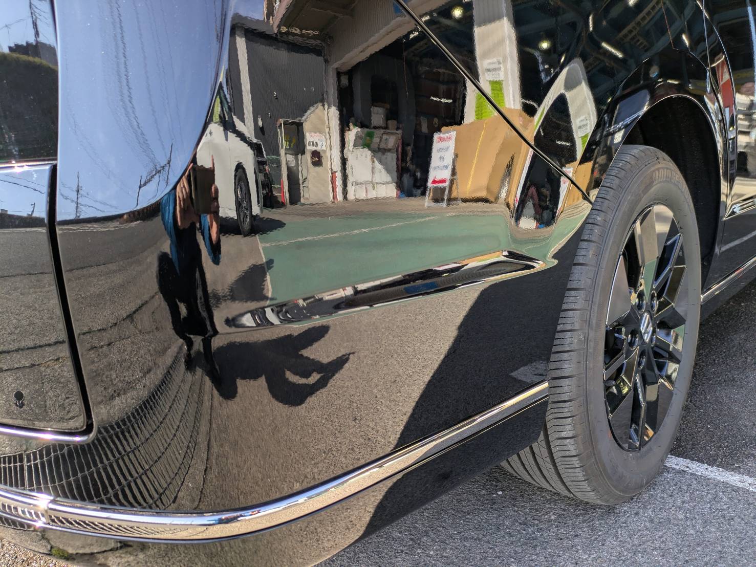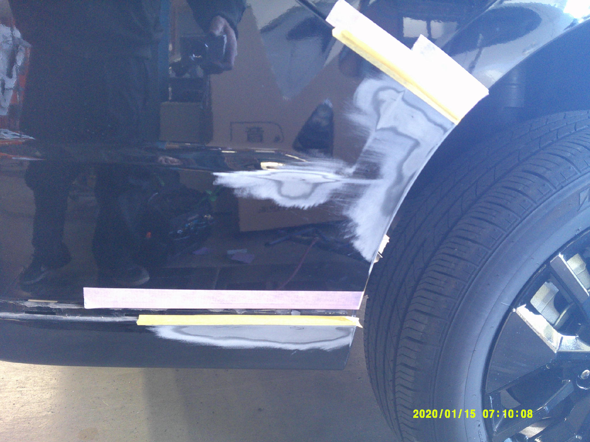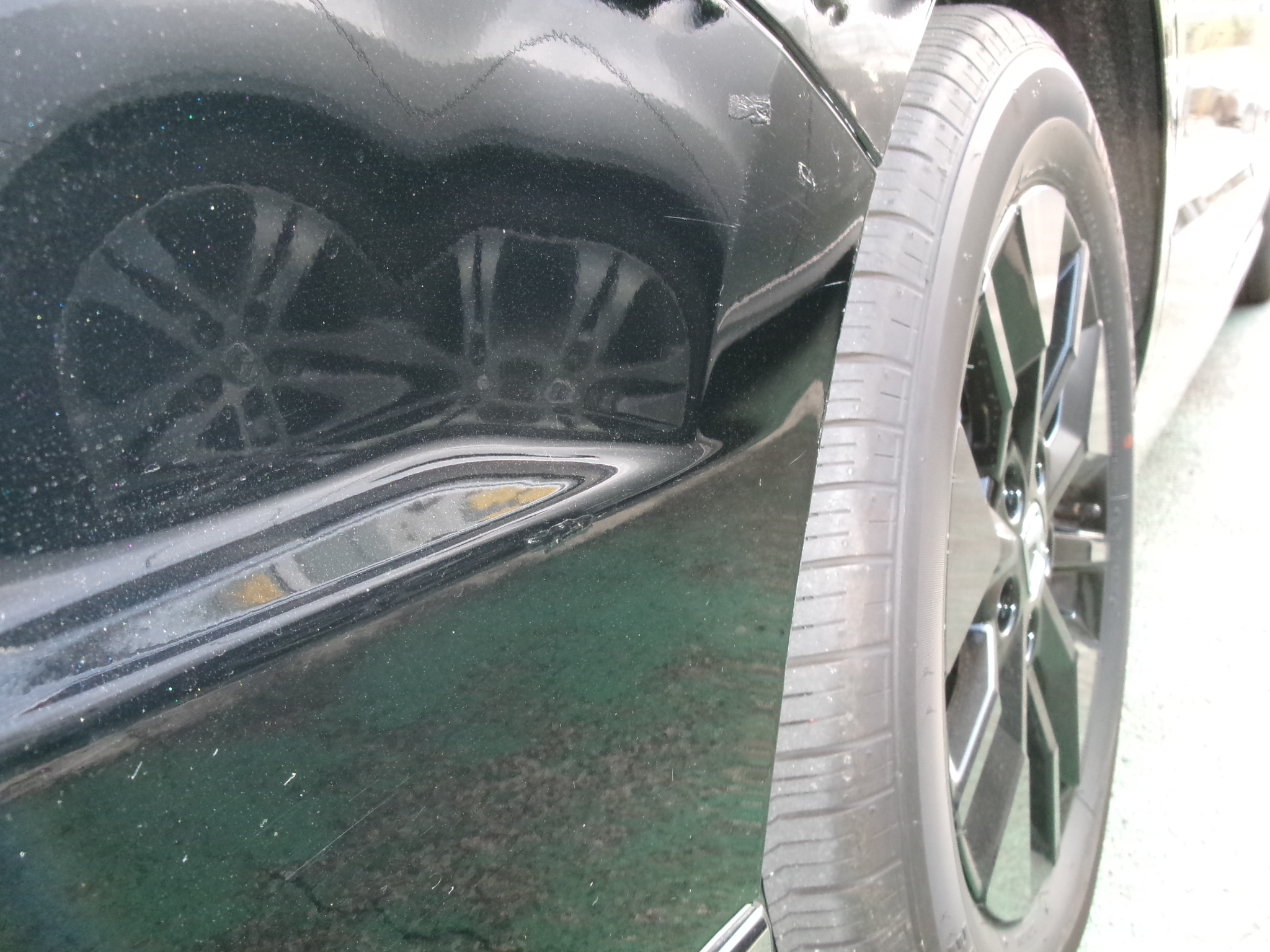 リアバンパー右側は、必要最小限に絞った部分塗装修理で対応。左フロントフェンダーは磨き作業のみで対応しました。