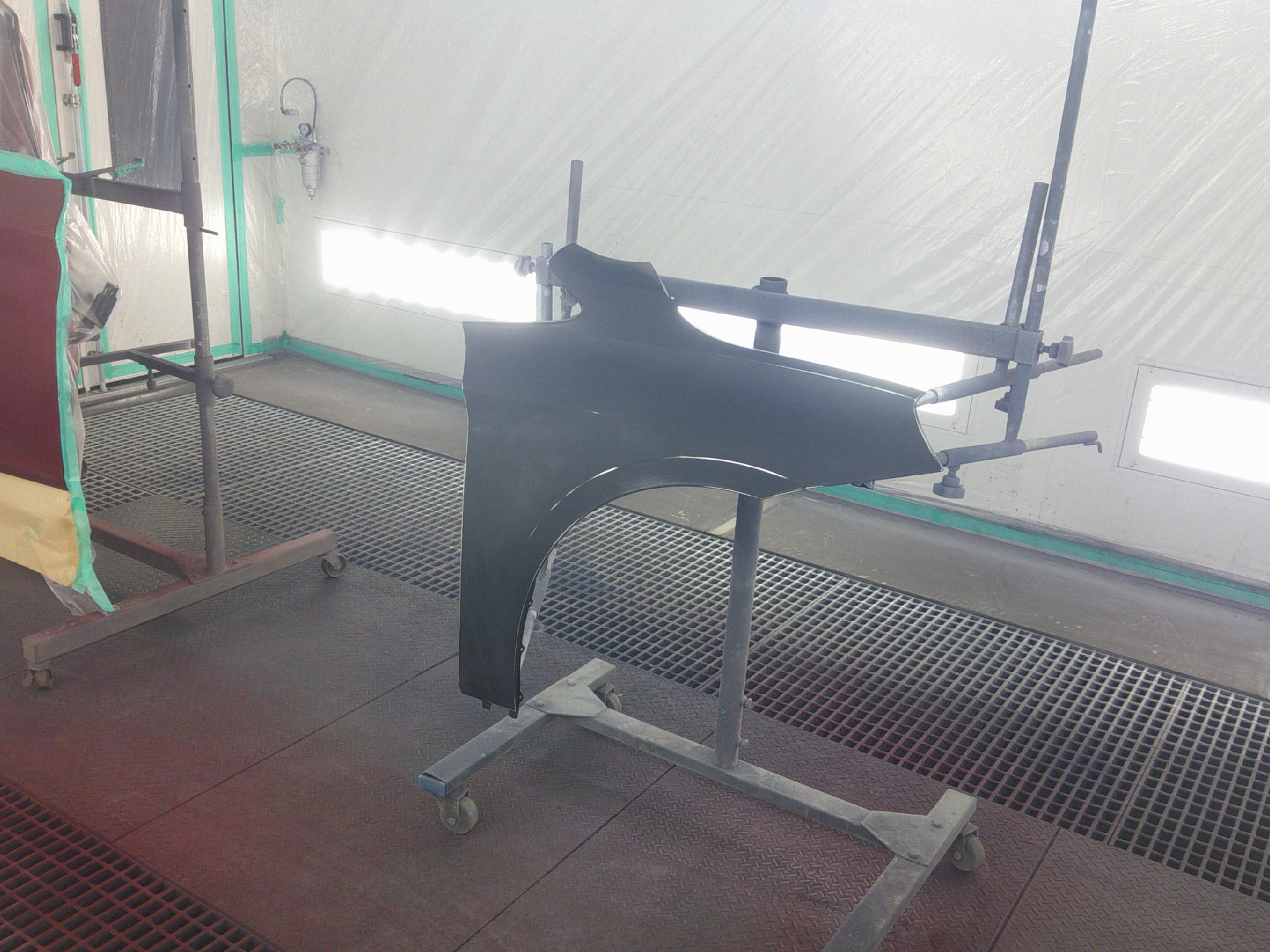 修理後は、フロントバンパー・右前フェンダーともに新品部品へ交換し、