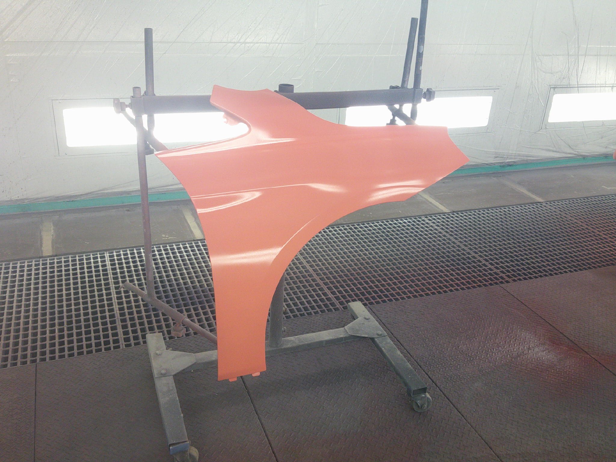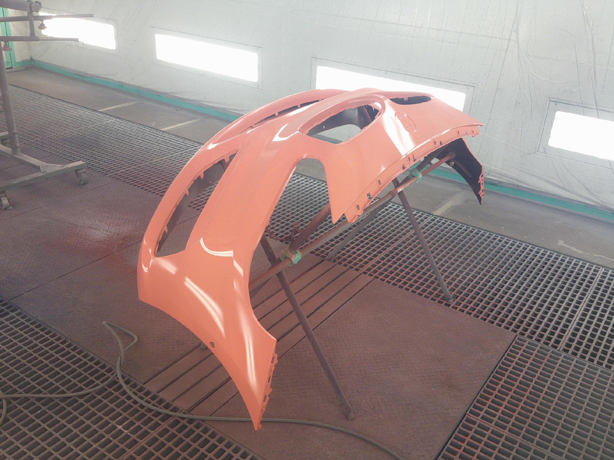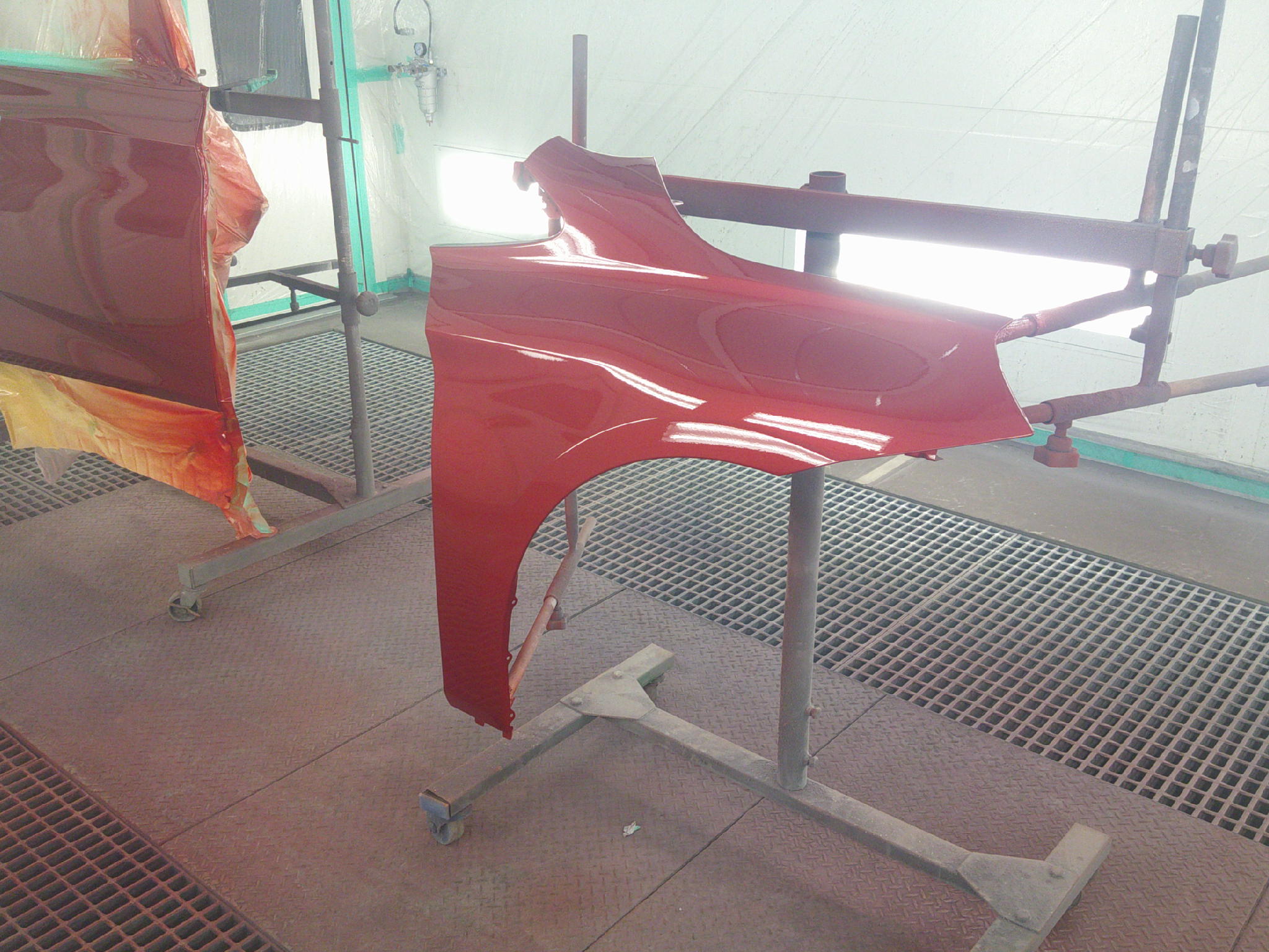 赤系の低隠蔽カラーは、こうした損傷部分で色の差が出やすく、塗装方法にも配慮が必要な状態でした。