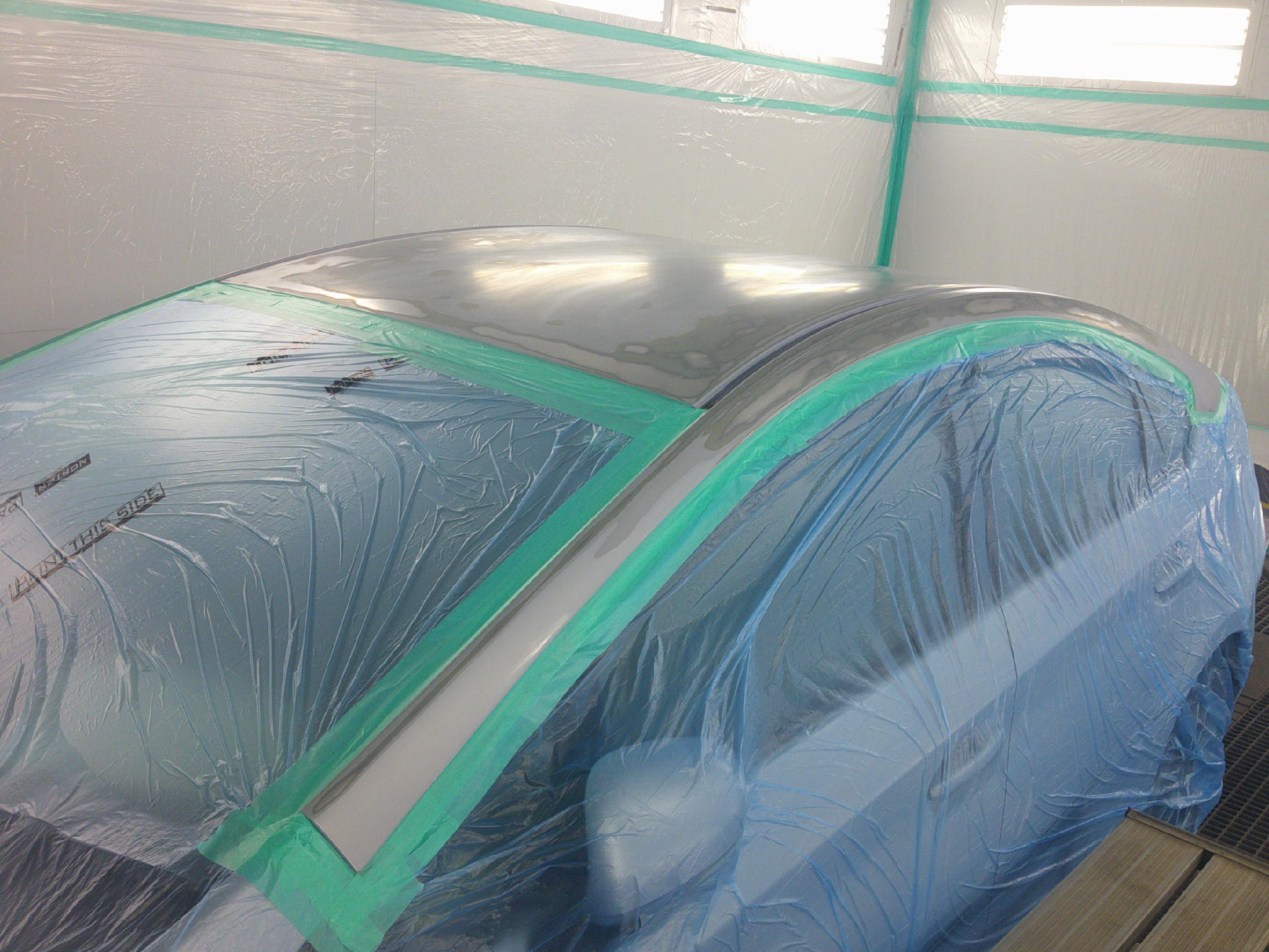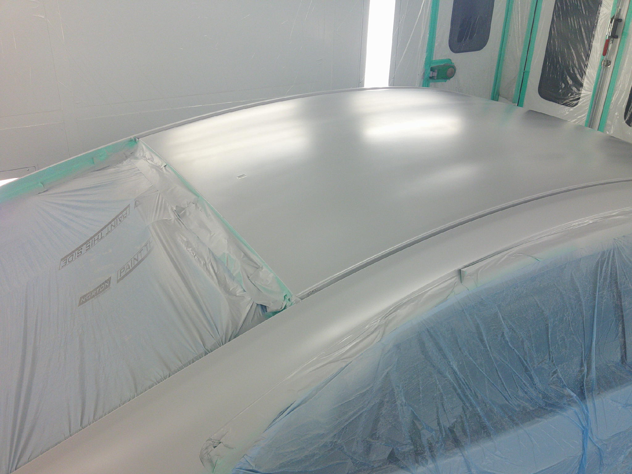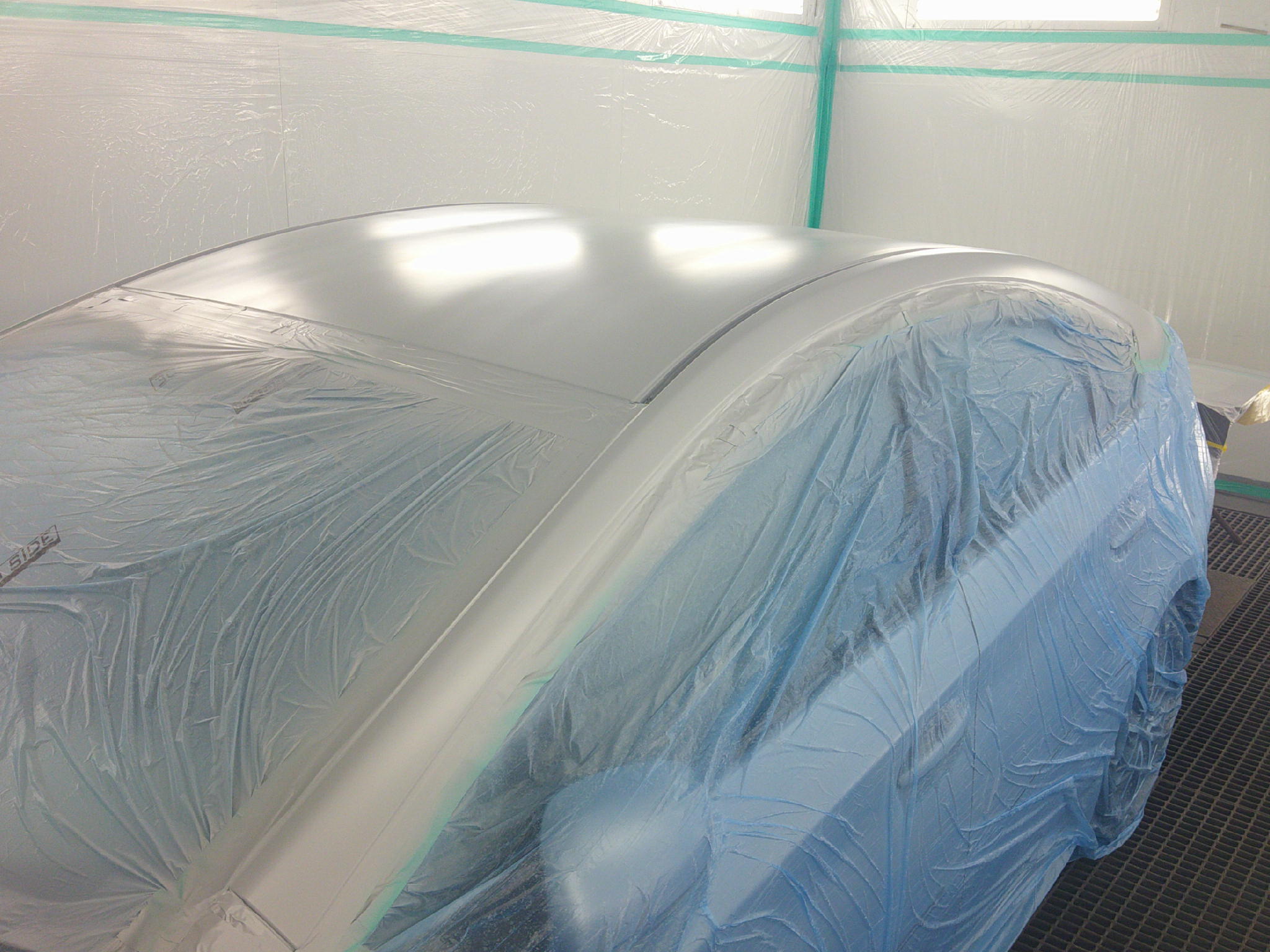 今回のお車は、中古車として購入されたトヨタ30系プリウス。全体的なコンディションは良好でしたが、ルーフ・クオーターパネル・バックドアにかけて、クリア塗装が劣化し、白い斑点が広範囲に出ている状態でした。また、FRバンパーにも大きなヘコミが確認でき、修理よりも交換したほうが仕上がり面で適していると判断しました。