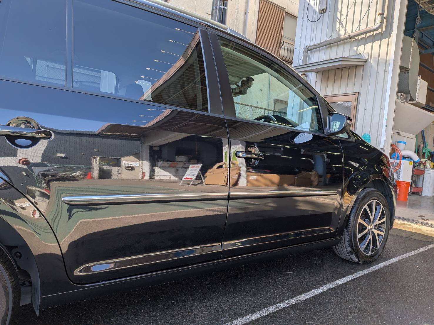 今回のお車はVWトゥーラン。ロッカーパネルから前後ドアにかけて、深い凹みがいくつか発生している状態でした。側面全体のバランスが崩れ、見た目にも影響が出やすい損傷です。
