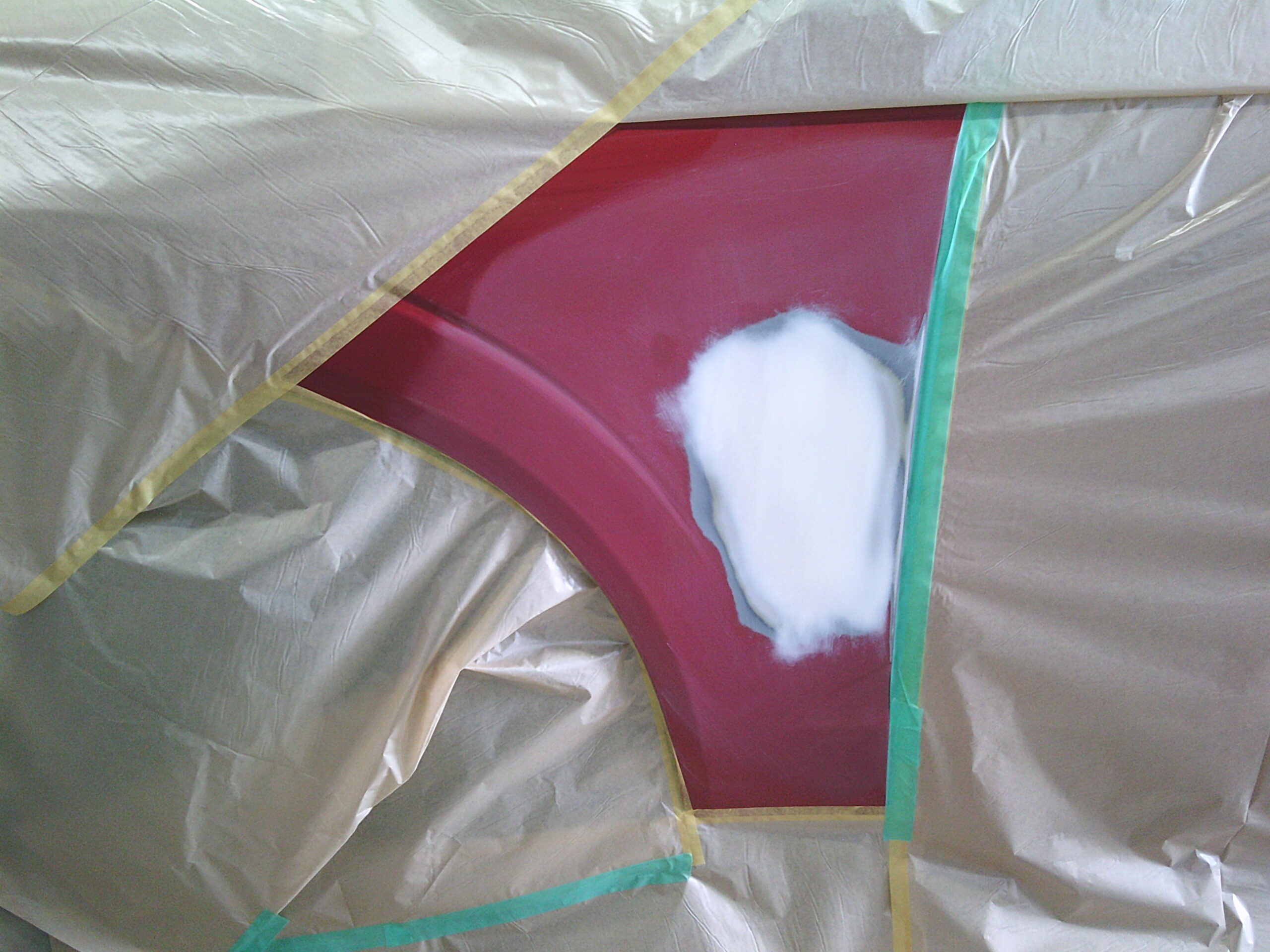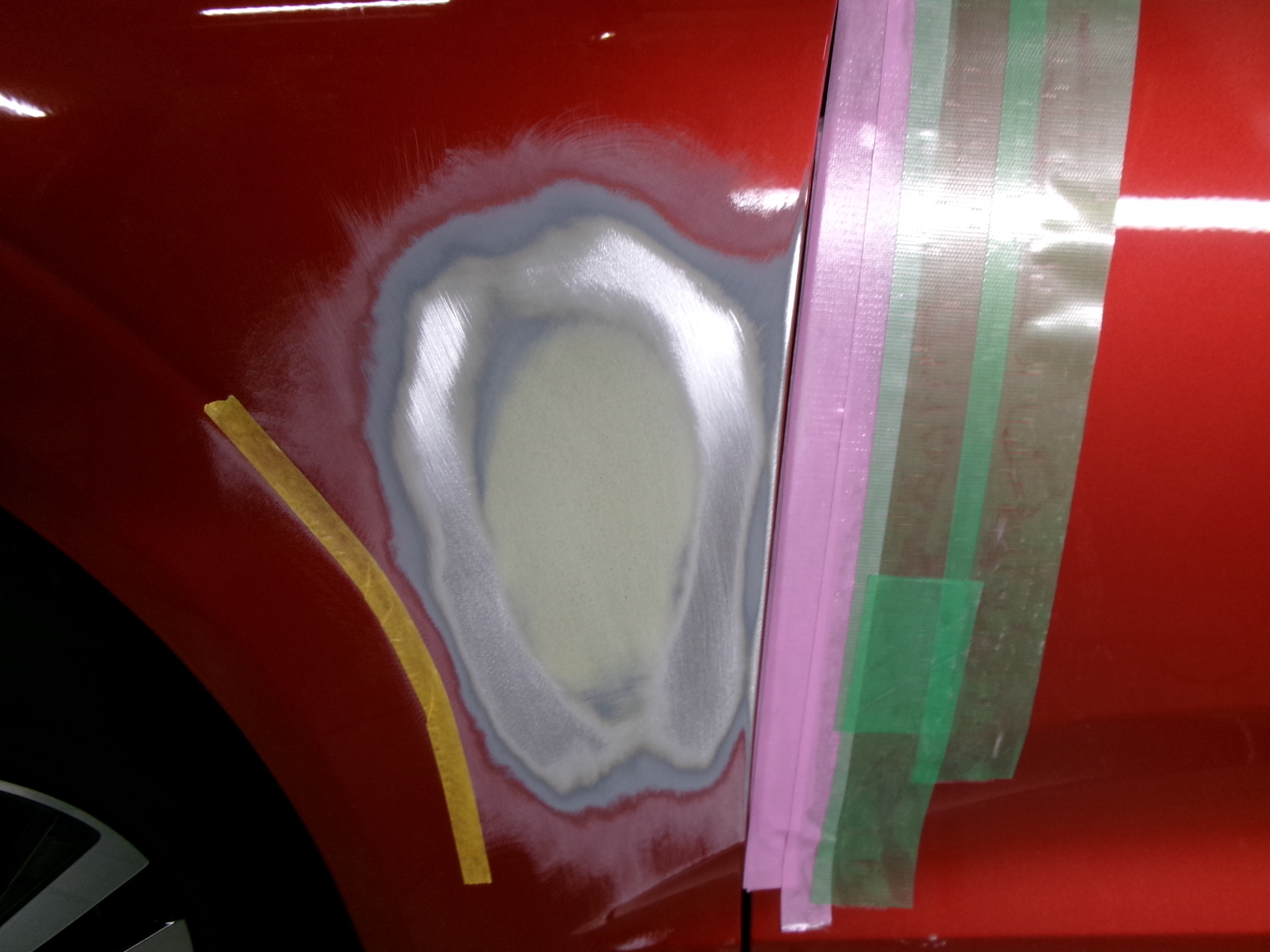 今回のケースは、駐車中に隣のお車のドアが風で当たってしまった「ドアパンチ」による左フロントフェンダーのヘコミです。このような場合、相手方の対物保険を活用して修理を進めることが可能です。損傷は局所的ではありましたが、見る角度によってははっきりとわかる状態でした。